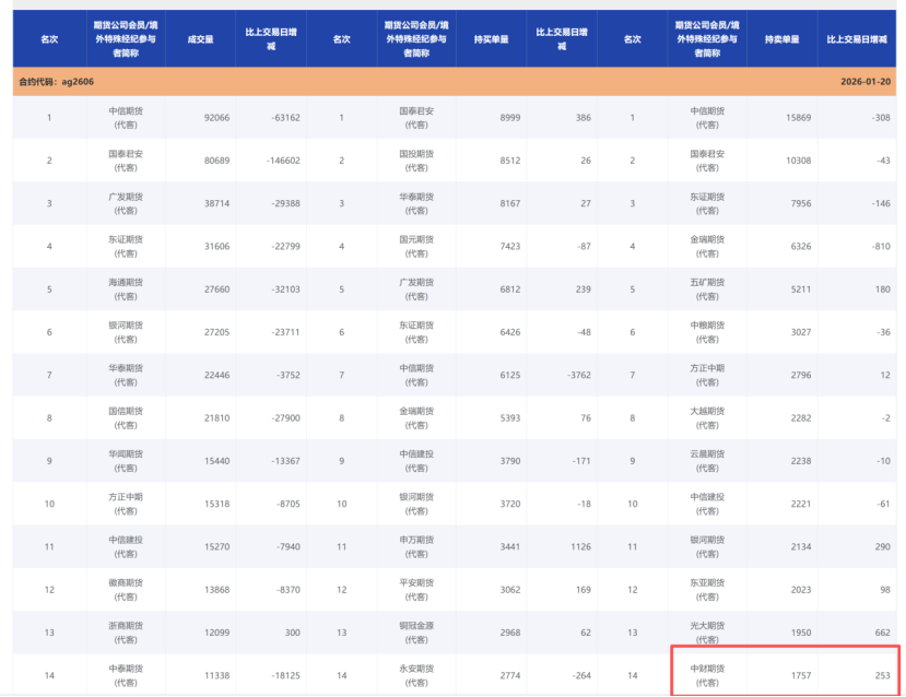 根据沪银期货此前的数据来看,在1月20日,中财期货(代客)仅出现AG2606合约的持仓排名表中,彼时持有空单1757手。